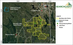 - Located 16 km west of Creighton, Saskatchewan and Flin Flon, Manitoba and 15 km from Searchlight’s Bootleg Lake brownfield mine site.