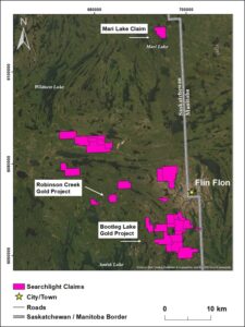 Vancouver, British Columbia, April 20, 2026 – Searchlight Resources Inc. (“Searchlight” or the “Company”) (TSXV: SCLT, US: SCLTF) is pleased to announce that the Company has staked the Mari Lake high-grade gold project located approximately 30 km north of Creighton, Saskatchewan and Flin Flon, Manitoba, and 40 km north of the Company’s Bootleg Lake Gold Project (Map 1).