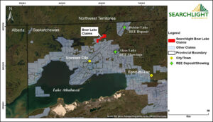 Vancouver, British Columbia, January 20, 2026, – Searchlight Resources Inc. (“Searchlight” or the “Company”) (TSXV:SCLT, US:SCLTF) is pleased to announce the initial results of the airborne radiometric and magnetic surveys on the Company’s Bear Lake Rare Earth Element (“REE”) project, located approximately 30 km north of Uranium City, Saskatchewan (Map1).
