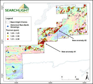 Special Projects Inc. of Calgary, Alberta, completed airborne radiometric and magnetic surveys covering 1,110 km of flight lines at 50 m spacing. Radiometric results confirm historically known rare earth anomalies, and have also identified large, previously unexplored anomalies that warrant follow-up exploration. New anomaly #1 (Map 2) is a large thorium zone measuring 600 m x 500 m, a previously unknown and unsampled target, shown at a larger scale on Map 3. New anomaly #2 is a linear thorium zone greater than 1.5 km in length, along the shore of Ena Lake. Searchlight uses thorium as pathfinder for monazite, a principal rare earth mineral.