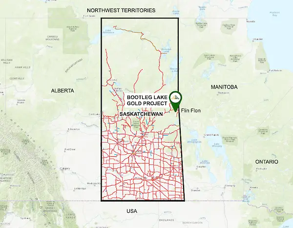The Bootleg Lake Gold Project is located near Creighton, Saskatchewan, Canada – five kilometres southwest of the city of Flin Flon, Manitoba. Flin Flon is a major mining centre within the Flin Flon Snow Lake Greestone Belt.